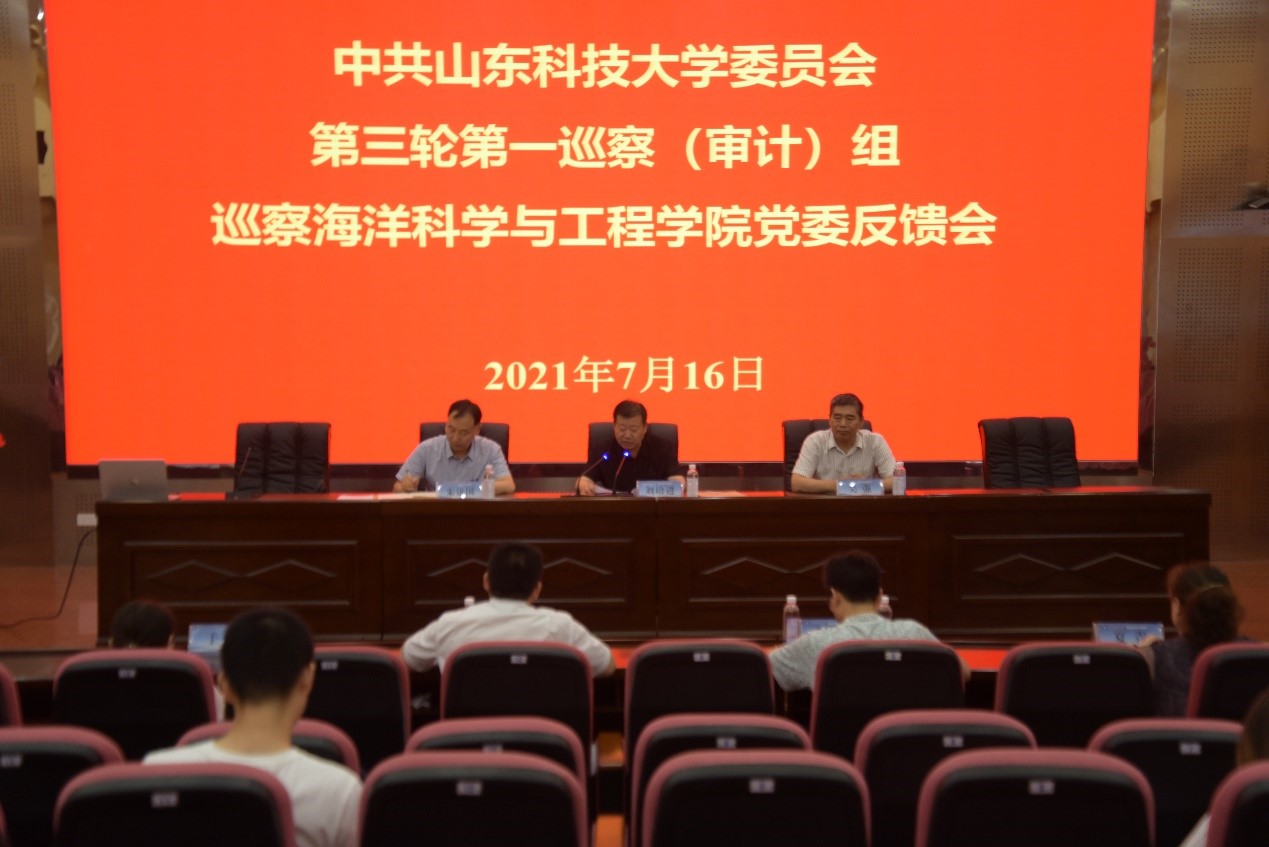 7月16日,校党委第一巡察(审计)组向海洋科学与工程学院党委反馈巡察情况大会在J9-144报告厅举行。校党委第一巡察组组长刘培进代表巡察组、意识形态专项巡察组向学院党委反馈巡察情况,学院党委书记朱建国主持会议并就做好巡察整改工作表态发言。