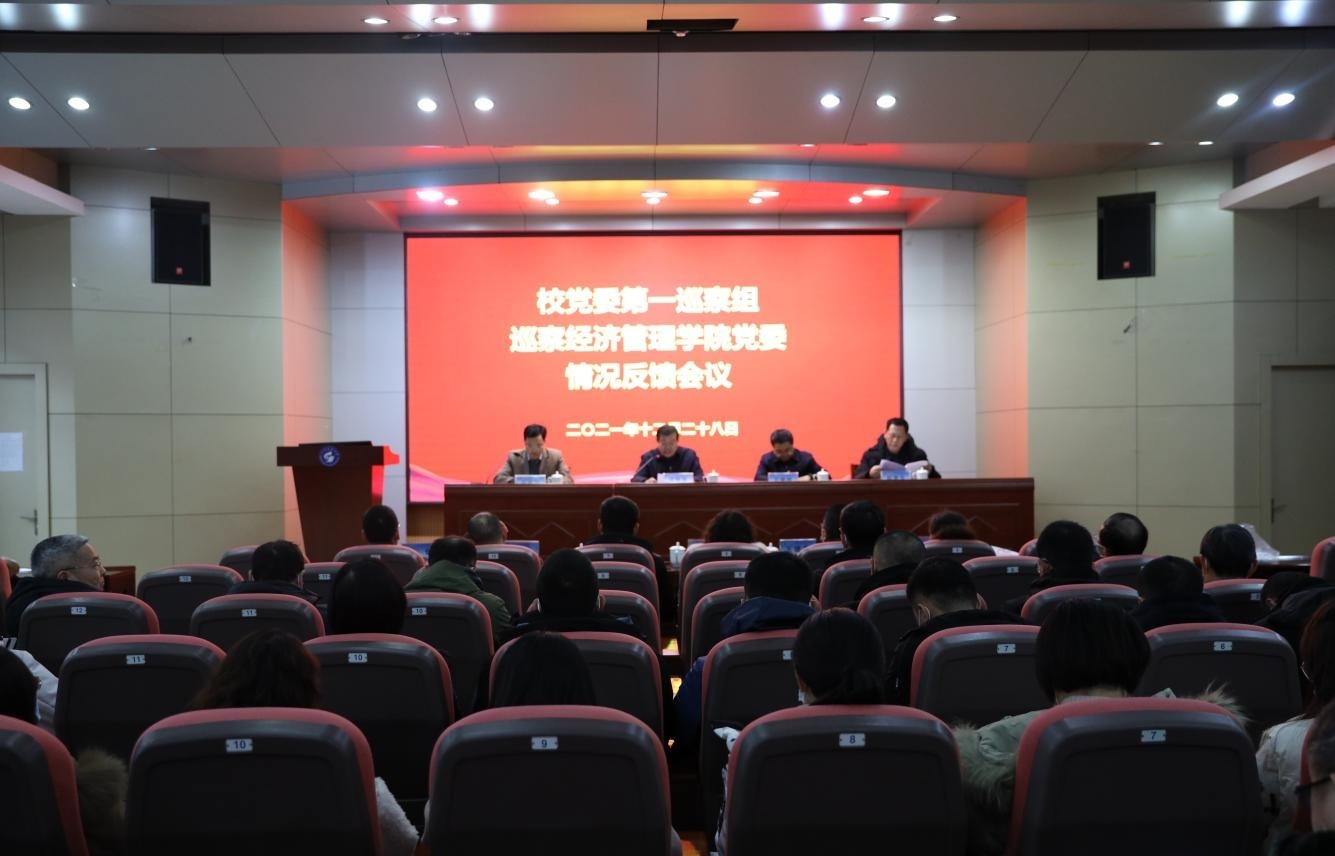 12月28日下午,校党委第一巡察组巡察经管学院党委意见反馈会在经管学院四楼报告厅召开。校党委第一巡察组组长刘培进,副组长尹增德,成员王华玲、刘华伟、王建友、夏青、边炳,意识形态工作专项巡察组成员范俊峰出席会议。经管学院党委班子成员、全体教工、退休教师代表和学生代表参加了反馈会。会议由经管学院党委书记庄兴华主持。